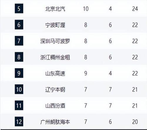 宁波、深圳和浙江以8胜战绩位列6-8位。黑马宁波队本轮大胜山西,攻守两端均压制对手,展现出强劲的上升势头。深圳队凭借快速的攻防转换和侵略性打法,让对手难以跟上节奏。浙江队则已取得四连胜,状态持续升温,成为中游集团的有力竞争者。