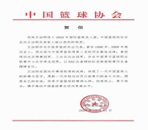 北京时间12月21日,中国球员王治郅入选FIBA名人堂,中国篮球协会发贺信表示祝贺。