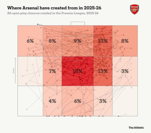 即使在厄德高因伤缺席多场比赛的情况下,阿森纳本赛季英超仍有29%的运动战机会是从这个区域创造的。