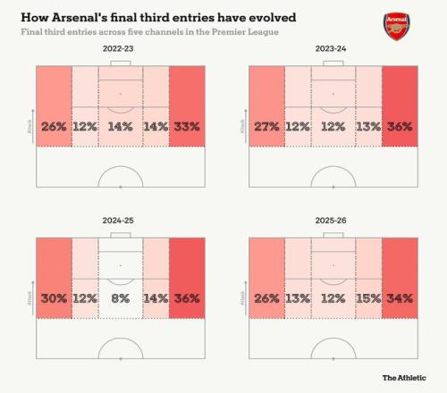 阿森纳遵循着同样的模式,将进攻三区的进入点集中在边路(右路和左路分别占34%和26%),与2024-25赛季相比,中路通道的比例略有上升。