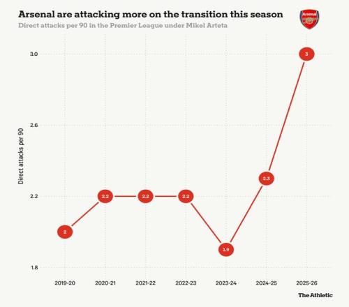 另一方面,阿森纳在2025-26赛季英超联赛中,被对手直接进攻的次数(43次)是第三少的。他们或许已经涉足纵向进攻的领域,但阿尔特塔的球队仍然保持着作为成功基石的控球打法。