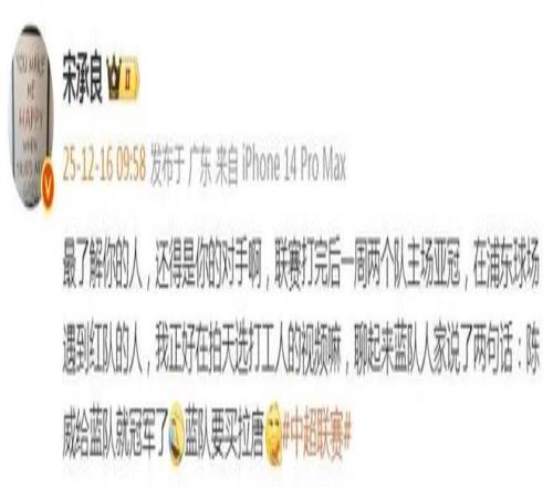 记者宋承良写道:“最了解你的人,还得是你的对手啊。(中超)联赛打完后一周两个队主场亚冠,在浦东足球场遇到红队的人,我正好在拍天选打工人的视频嘛,聊起来蓝队,人家说了两句话:陈威给蓝队就冠军了,蓝队要买拉斐尔-拉唐。”